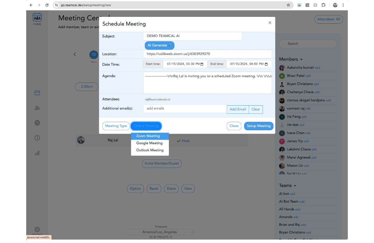 When you are creating a Meeting in TEAMCAL AI, you can select Zoom Meeting from the drop down this will create a Zoom Meeting wk\ith the new URL